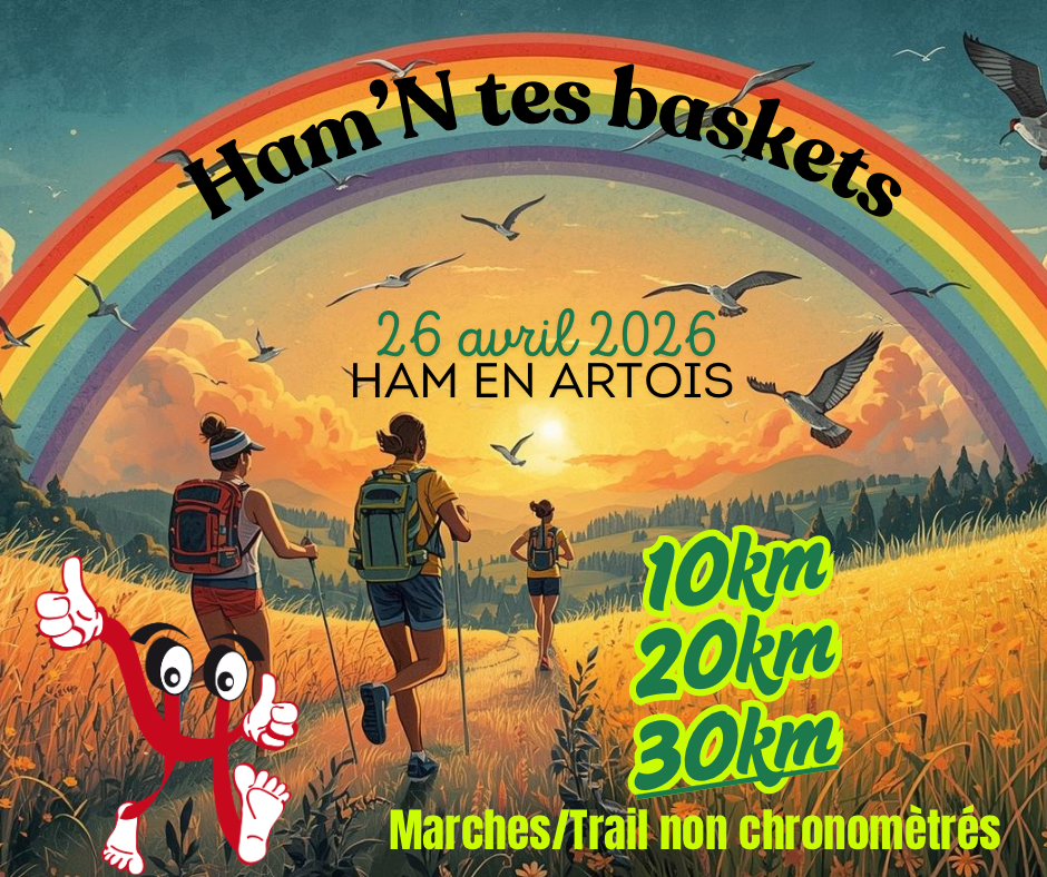 Les Ham’is, Ham’N tes baskets est de retour en 2025 pour sa 9ème édition! Elle aura lieu le dimanche 27 avril 2025 à Ham en Artois(62).  2025 marque un tournant puisque c’est l’arrêt des compétitions courses jeunes et 5km/10km.  Nous souhaitons recentrer Ham’N tes baskets sur ces aspects : nature, plaisir et solidarité. Avec toujours des baskets aux pieds, que ce soit en marchant ou en courant 🙂 Il y aura 3 randonnées/Trail non chronométrés de 10km / 20km et 30km.  1 euro par inscrit sera remis à l’asso « Louna contre CDKL5 », Louna étant une fille polyhandicapée qui habite près de Ham en Artois, à Estrée Blanche plus précisément.  Les inscriptions seront lancées le 13 décembre 2024 à 13h12. Facile à retenir : le 13/12 à 13h12 !  ET ça se passe ICI
