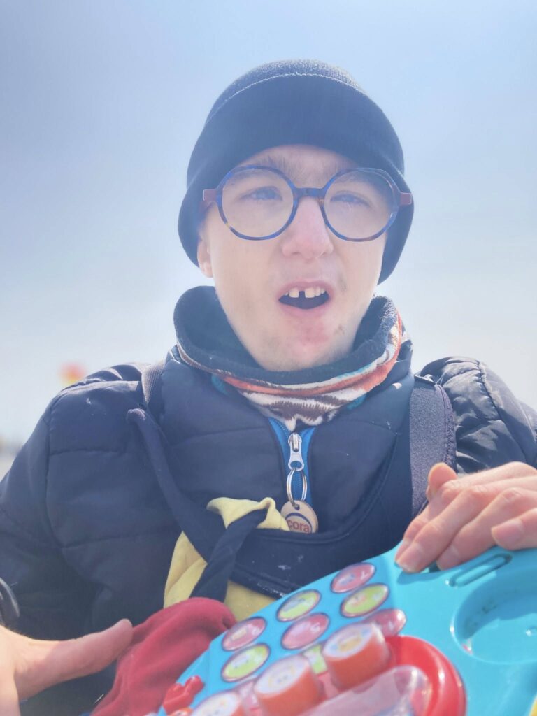 Ses sorties hors domicile se font en fauteuil roulant manuel car déjà ça le rassure, il est dans sa bulle, et il est vite fatigué à cause de ses problèmes de coordination et motricité, cela lui demande beaucoup d’effort de concentration…